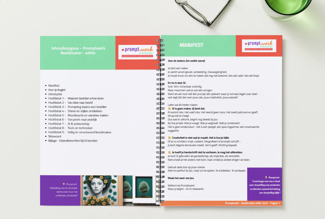 Je werkt direct met slimme prompts, praktische opdrachten en herkenbare voorbeelden. Je blijft volledig eigenaar van je creatieve keuzes.